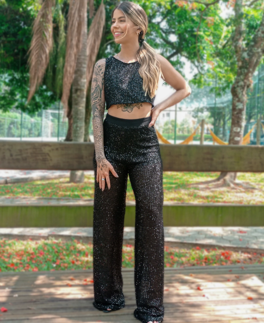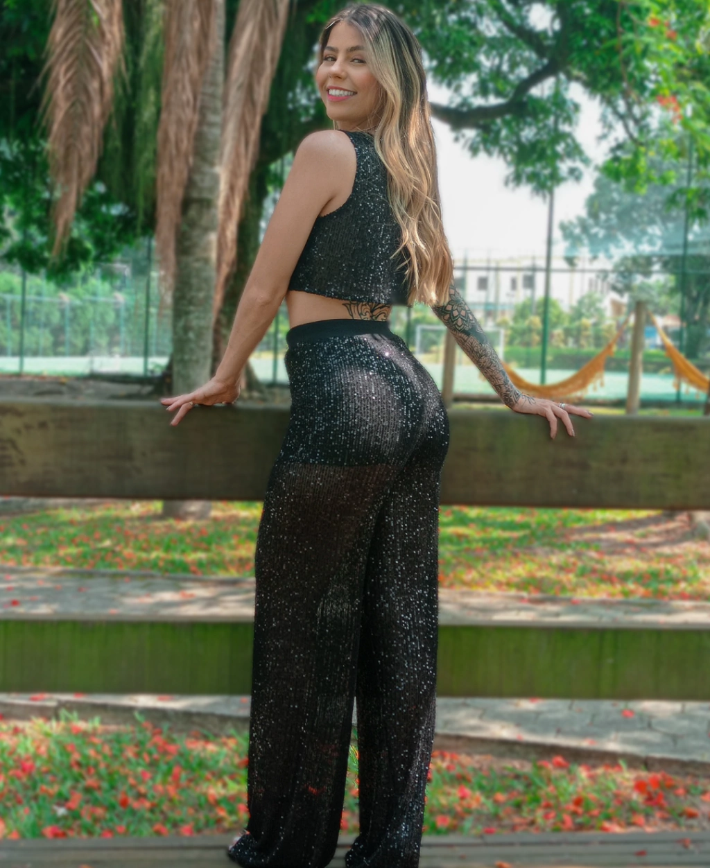 Brilho Continuado: A calça complementa o conjunto, mantendo o mesmo padrão de paetês reluzentes, proporcionando um visual harmonioso e coeso.