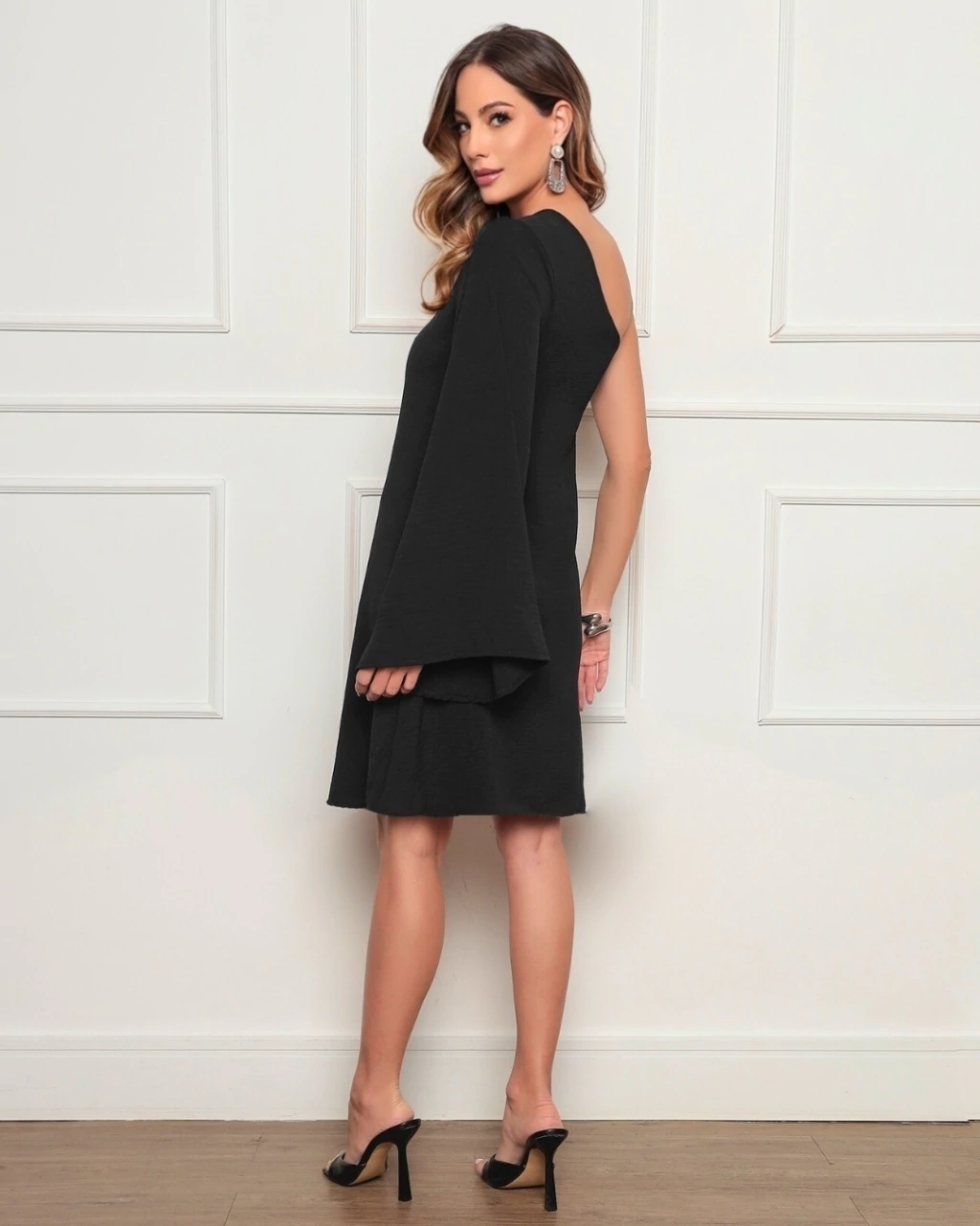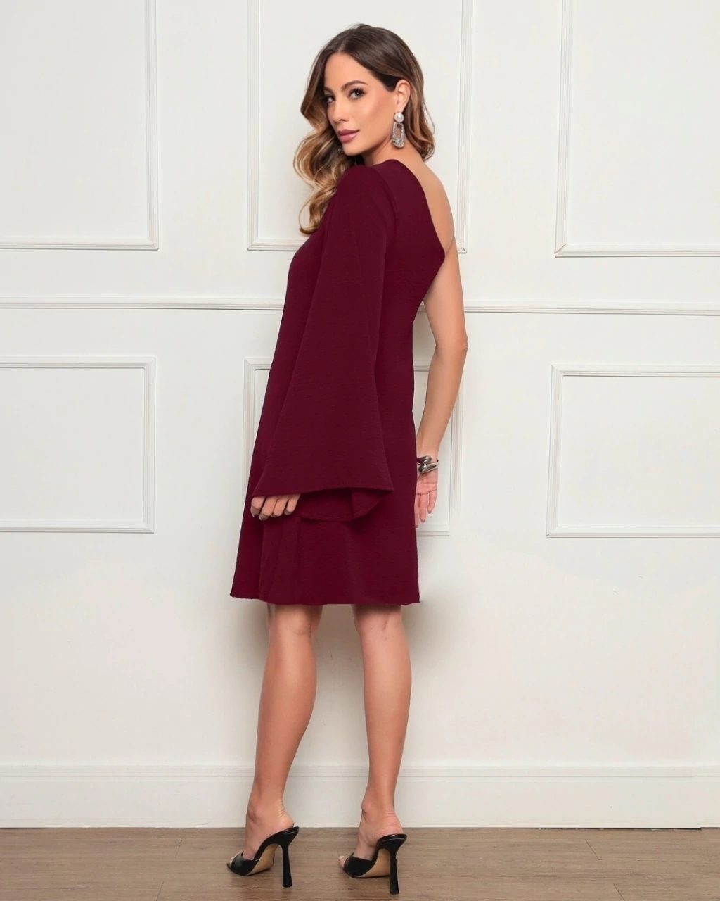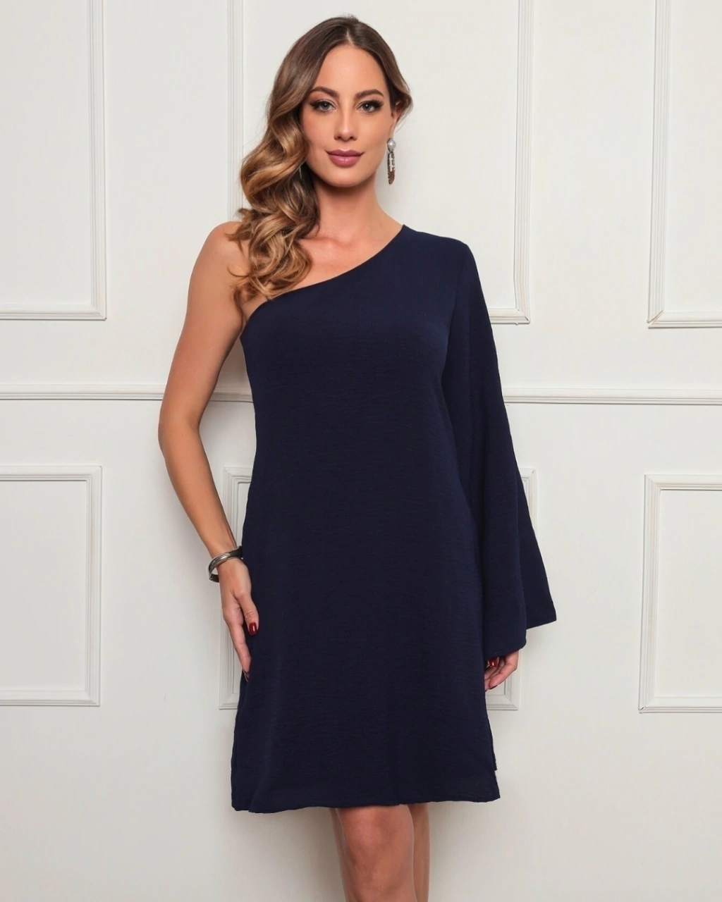 O design assimétrico de um ombro só, aliado à modelagem soltinha, garante conforto sem abrir mão da elegância.