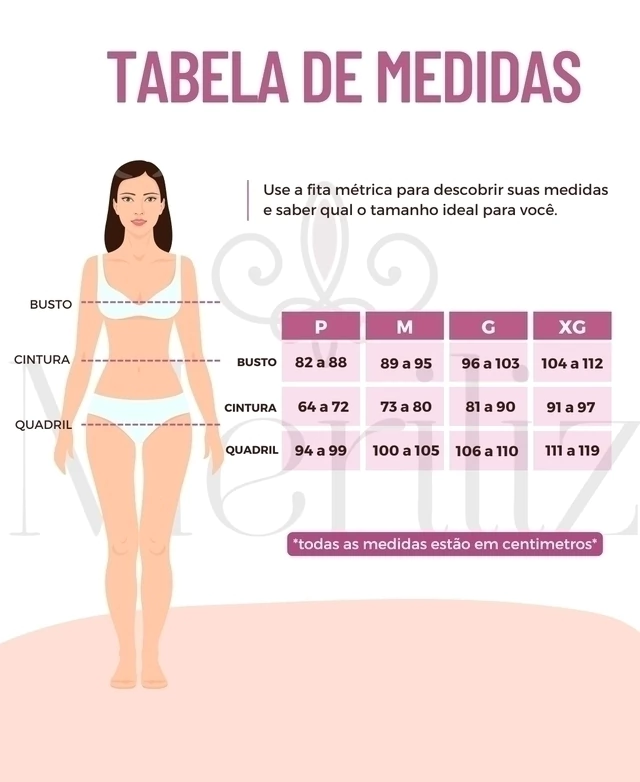 | Tamanho | Busto | Cintura | Quadril |