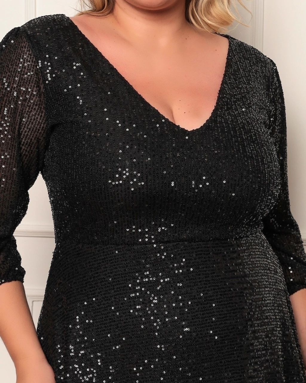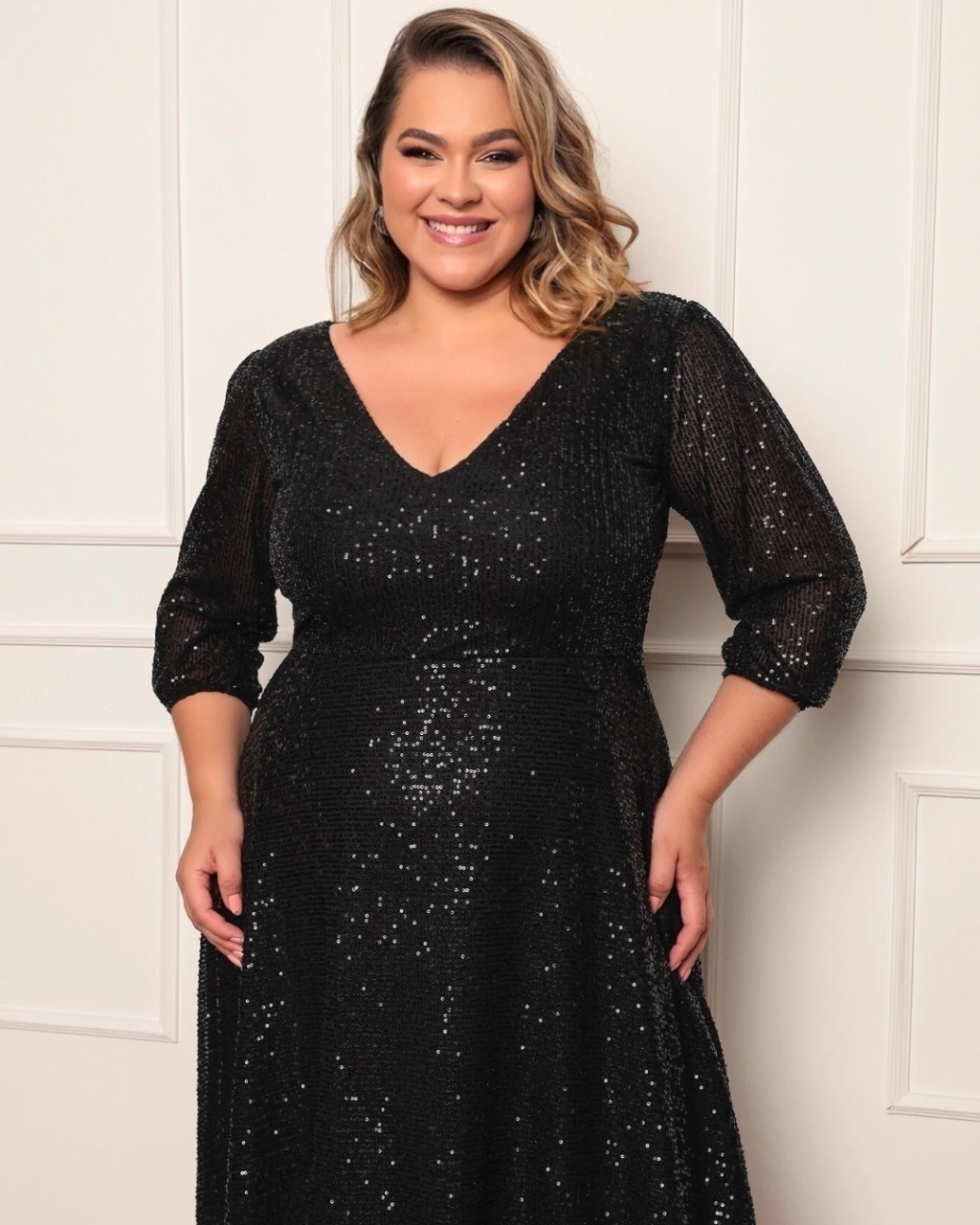 Feito para mulheres que amam se destacar, este vestido curto plus size é confeccionado em tecido de paetê que traz luminosidade e elegância ao look.