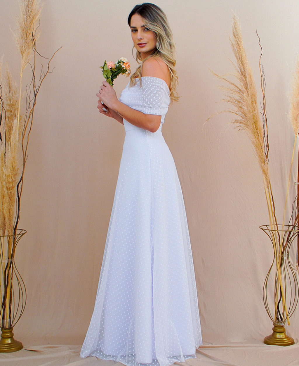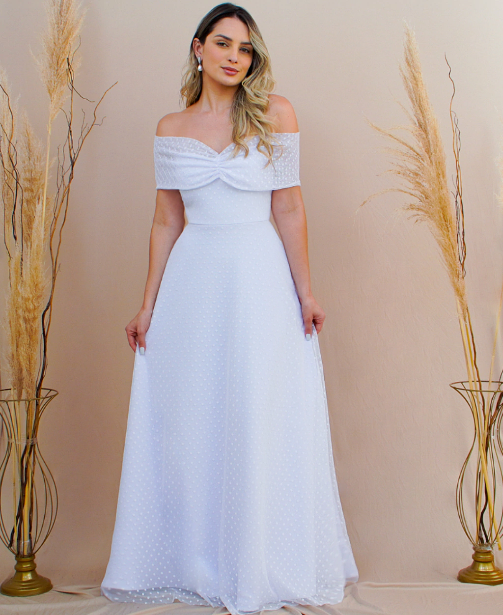 Longo Elegante: A saia longa confere uma presença majestosa, proporcionando um visual sofisticado para a noiva civil.